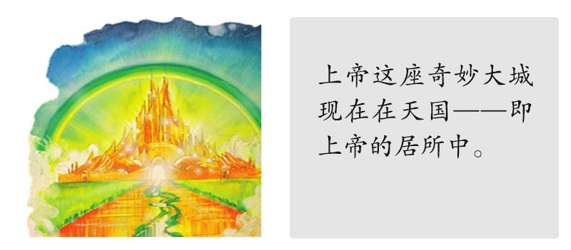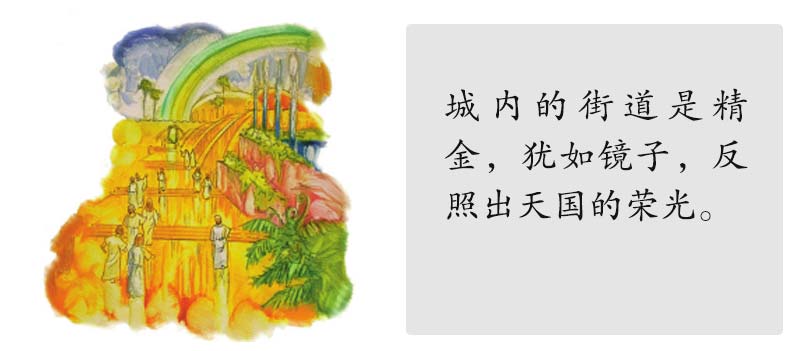 “圣城……,预备好了,就如新妇妆饰整齐,等候丈夫。”“城中有上帝的荣耀。城的光辉如同极贵的宝石,好像碧玉,明如水晶。”“城是四方的,……长、宽、高都是一样。”(启示录21:2,11,16)这圣城将有各种宝石、精金和美丽的光辉,上帝的荣光照耀全城。在令人惊异的庄严和纯洁中,犹如“新妇妆饰整齐,等候丈夫。”