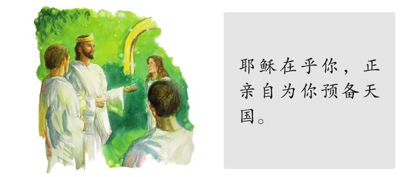 “愿意的,都可以白白取生命的水喝。”(启示录22:17)“可以得着不能朽坏……为你们存留在天上的基业。” (彼得前书1:4)“我去原是为你们预备地方去。”(约翰福音14:2)
