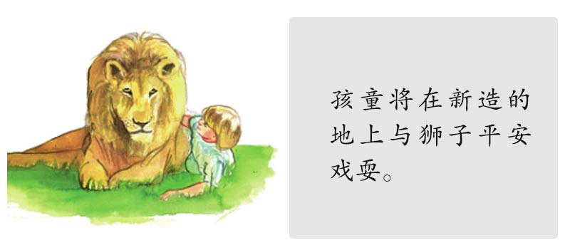(3)野兽驯服, 再无野性,不再互相残食,小孩子要牵引它们。(以赛亚书11:6-9;65:25)