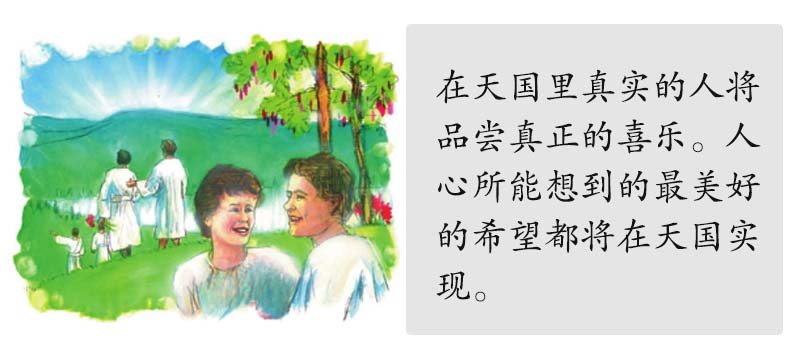 有教义说:在天国里,得救的人将只具有灵魂,他们的灵魂将飘在空中,整天弹琴而不做别的事,这是毫无圣经根据的。耶稣钉死在十字架上,为那些接受祂的爱和跟随祂的人预备的不是这种庸俗无趣、迂腐愚昧的将来。大部分人对这样虚幻的存在不感兴趣,因此,也没有什么进上帝天国的欲望,只是惧怕地狱的刑罚。世人若知道上帝圣城及新天新地的真实情形,千千万万的人必明白祂的慈爱,就会全心全意地转向祂。人若错失天国,乃是一生最大的错误和遗憾。