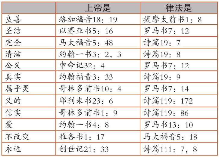 注意上面图表,上帝和祂的律法具有相同的特性。你看明白了吗?这十诫即是以文字表述出来的上帝的圣德,以便于我们领悟。上帝的律法之不可能改变,犹如不可能把上帝从天庭拉下来并改变祂一样。耶稣到世上成为人的样式,即向世人表明,作为圣洁生活之规范的律法行在人身上该是怎样的。上帝的圣德永不改变,祂的律法也不会改变,因为律法本是通过人类语言所表述出来的上帝圣德。