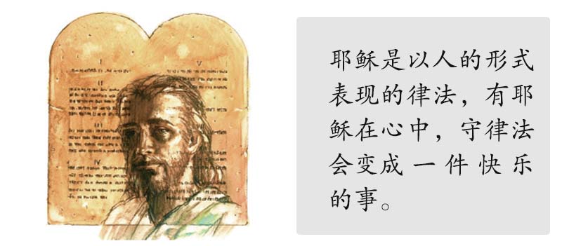“我要将我的律法放在他们里面,写在他们心上。”(希伯来书8:10)“我靠着那加给我力量的,凡事都能作。”(腓立比书4:13)“律法既因肉体软弱,有所不能行的,上帝就差遣自己的儿子成为罪身的形状,作了赎罪祭,在肉体中定了罪案,使律法的义成就在我们这不随从肉体,只随从圣灵的人身上。”(罗马书8:3,4)
