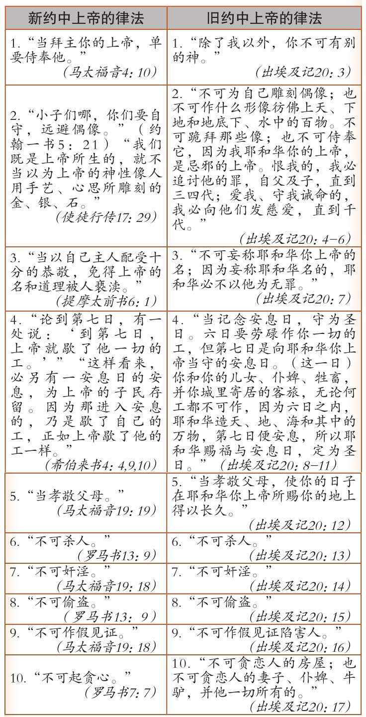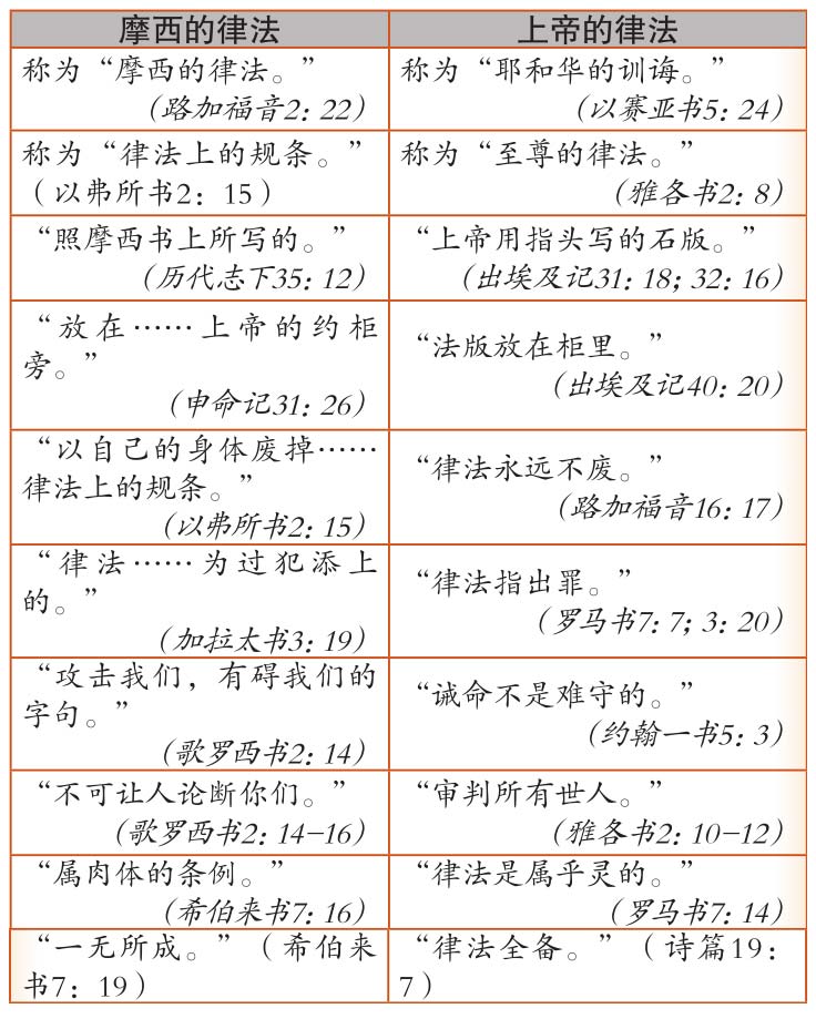 注:旧约摩西的律法是暂时的,是旧约时的仪文律法。它规定祭司的职分、献祭、仪式、祭物、奉献礼等等。这些都是预表,是十字架的影子。这些仪文律法被添上,直“等候那蒙应许的子孙来到”为止,那位“子孙”就是基督。(加拉太书3:16,19)摩西律法中的仪式与礼节,预指基督的牺牲。耶稣被钉死的时候,这些有预表性的仪文律法就结束了。但十诫(上帝的律法)“是永永远远坚定的。”(诗篇111:8)两种律法的分别在但以理书9章10节和11节中有清楚的记述。