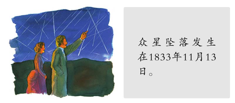 应验:于1833年11月13日晚众星坠落,照得天空透亮,可以街上捧读书报。有一位作者这样记叙说:“那晚几乎有四小时天空照耀如昼。”有人以为世界末日已经来临。看看这预兆,这是基督再来的重要兆头之一。摘自彼得?米利门(Peter A. Millman)所著:《众星坠落》,发表在《望远镜》,1940年五—六月刊。(The Teleschope,7(May~June,1940)57.)