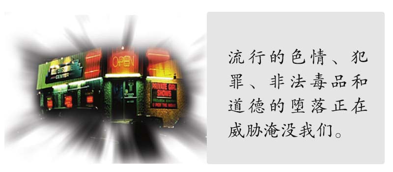 美国及世界各国都陷在极大的危机中。社会各个行业的人对这种危机都有相同的感受。自杀变为解决难题的普遍方式。离婚率不断上升,几乎每两对婚姻中即有一对走上离婚。现今不道德的时代,充满男女两性不正常的媾合淫乱和腐败。基督徒人数虽然增加,但虔敬的心在减弱。这种现象完全应验了圣经的话。令人震惊的是,看看提摩太后书3章1至5节所列出的项目,在每日报刊上都能发现这些事情,邪恶的浪涛已经吞灭这世界。
