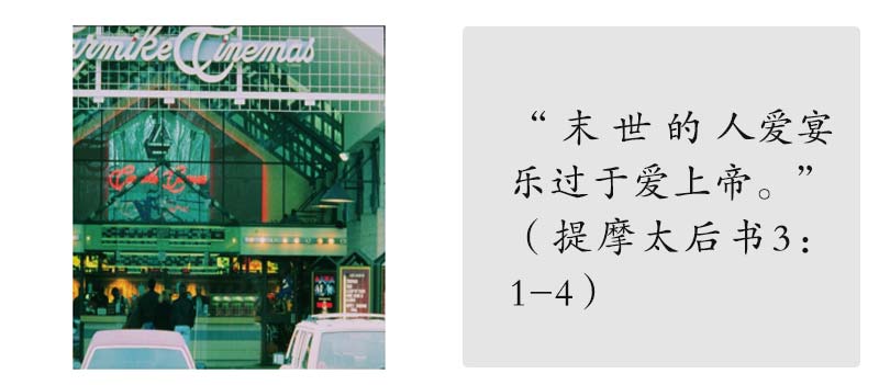 这世界追求享乐已到疯狂之地步。在城市仅有少数的人定期上教堂聚会,但观光游乐地点挤满人潮。美国每年花费在玩乐的经费超过数百亿,而捐给教会的款项只是享乐费用之尾数。国人花许多时间看电视、追求娱乐,这种现象正应验以上之经文。