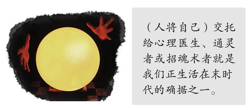 “他们本是鬼魔的灵,施行奇事。”(启示录16:14)“假基督、假先知将要起来,显大神迹、大奇事。倘若能行,连选民也就迷惑了。”(马太福音24:24)“人当以训诲和法度为标准,他们所说的若不与此相符,必不得见晨光。”(以赛亚书8:20)