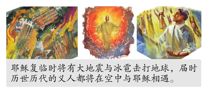 “看哪,他驾云降临,众目要看见他。”(启示录1:7)“因为主必亲自从天降临,有呼叫的声音和天使长的声音,又有上帝的号吹响,那在基督里死了的人必先复活。以后我们这活着还存留的人必和他们一同被提到云里,在空中与主相遇。这样,我们就要和主永远同在。”(帖撒罗尼迦前书4:16,17)