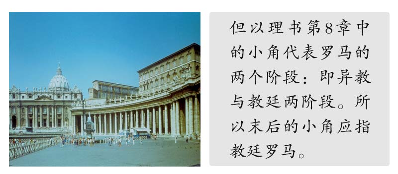 (1)配合预言“重复与扩展”的原则,罗马一定是此处所代表的权势。因为在但以理书第2章和第7章,指出罗马是继希腊之后的王国。但以理书7章24节和27节也证实教廷罗马必为基督的王国所取代。但以理书第8章的这个小角正好符合这个模式:它在希腊之后,并终于在耶稣第二次降临时被非由人力毁灭或“非因人手”而灭亡。(比较但以理书8章25节和但以理书2章34节。)