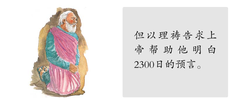 在但以理见了第8章的异象之后,天使加百列前来向他解释这个异象。但当加百列提到2300日时,但以理俯伏在地,又病了一段时间。他重新得到力量,并继续做王的事务。但他非常关切异象中尚未解释的部分——2300日。但以理很恳切地为他那些被俘虏到了玛代波斯的本国之民祈祷。他承认自己的罪,并且求上帝宽恕他的本族人民。但以理书第9章以先知诚恳的认罪祈祷开始,继之以对上帝的祈求。第8章与第9章之间相隔近十年,而但以理祷告不断,其诚恳迫切之心跃然纸上。