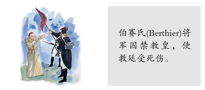这个死伤是拿破仑的将军所带来的。主后1798年二月,伯赛氏(Berthier)进入罗马,俘虏了教皇庇护六世。拿破仑出令在教皇死的时候,罗马教廷将随之结束。教皇于1799年八月死在法国。“半个欧洲以为……随着教皇死去,罗马教廷也完了。”【注4】