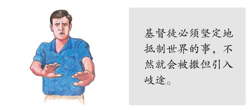 (1)不要爱这个世界以及世上的东西,世界上不属于上帝的东西有①肉体的情欲,②眼目的情欲,③今生的骄傲。(约翰一书2:16)所有的罪都不外乎这三种类别,撒但利用这三个途径来诱惑我们爱这个世界。当我爱这个世界时,就成了上帝的仇敌。(约翰一书2:15,16;雅各书4:4)