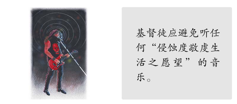 即使没有歌词,音乐本身就有能力败坏人的情感、欲望和思想。世俗的摇滚音乐人士公开承认这一点。滚石音乐主唱迈克尔?贾格尔(Mick Jagger)说:“你可感受到肾上腺素通过你的全身,那是一种性。”[注1]约翰?奥特(John Oates)说:“摇滚乐的99%都是性”。[注2]这样的音乐会得耶稣的喜悦吗?从海外归正的前异教徒告诉我们,现代世俗的乐队音乐,与他们在妖术及魔鬼崇拜中所使用的音乐是同一类的!我们不妨自问:“假如耶稣来拜访我,我和祂一同听什么音乐才会觉得合适?”你若对某种音乐拿不准,就得放弃。(为了深入分析颓废的、世俗的音乐,我们推荐一本卡罗和路易士合著的书,书名叫作《音乐漫谈》。)当我们爱上耶稣,祂会改变我们对音乐的癖好。“他使我口唱新歌,就是赞美我们上帝的话。许多人必看见而惧怕,并要倚靠耶和华。”(诗篇40:3)上帝已经给予祂的子民很多好的音乐,足以振奋、提升基督徒的体验。那些接受魔鬼堕落音乐的人,将错失生命中上好的福分。