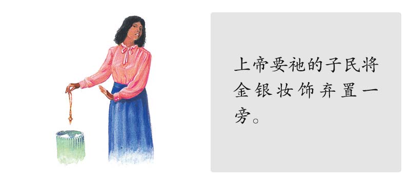 (2)抛开妆饰品和珠宝首饰。“今生的骄傲”是当前的一个大问题。耶稣的追随者看上去应当与众不同。他们的外表本身就应成为好的见证,带给人光明。(马太福音5:16)珠宝首饰会引人注目,高扬自我。圣经上说,这是退后与背道的表现。当雅各和家人再度献身于主时,便把珠宝首饰埋在地里。(创世记35:1,2,4)在以色列进入应许之地之前,上帝吩咐他们除去所有的装饰品。(出埃及记33:5,6)以赛亚书第3章,上帝明白地说祂的子民若是穿戴珠宝(如手镯、戒指、耳环等,19至23节)就必有罪了(第9节)。何西阿书2章13节中上帝说,当以色列人离弃上帝时,就开始佩带金银首饰。提摩太前书2章9节及彼得前书3章3节,保罗和彼得两人都告诉我们说,上帝的子民不要以金饰、珠宝和昂贵的服饰来妆饰自己。请注意彼得和保罗的确提到上帝要祂的子民穿戴的是:“以里面存着长久温柔安静的心为妆饰”(彼得前书3:4)以及以“善行”为妆饰(提摩太前书2:10)。耶稣在启示录12章1节总结,将祂的真教会比喻为一位身披日头(耶稣的光明与公义)的纯洁妇人,把背道变质的教会比喻成淫妇,用金银、宝石和珍珠为妆饰。(启示录17:3,4)上帝要祂的子民与巴比伦有所分别,(启示录18:2-4)从她所主张的一切中走出来,包括远离金银首饰,高扬自我之类的生活方式;而代之以披戴耶稣的公义。当我们真正爱耶稣时,就会以照祂的生活方式来生活为乐事。