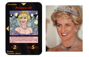 克林顿和莱温斯基,右边卡牌文字表明“可攻击任何男性名人,但必须由媒体发动。若成功,该男士将因丑闻无法再担任公职而退出游戏”。1998年,两人性丑闻被曝光。