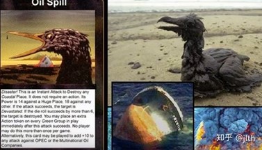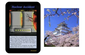 这张牌叫核事故。卡牌上核电站冷却塔的裂痕酷似日本樱花。2011年,日本福岛核电站泄漏。